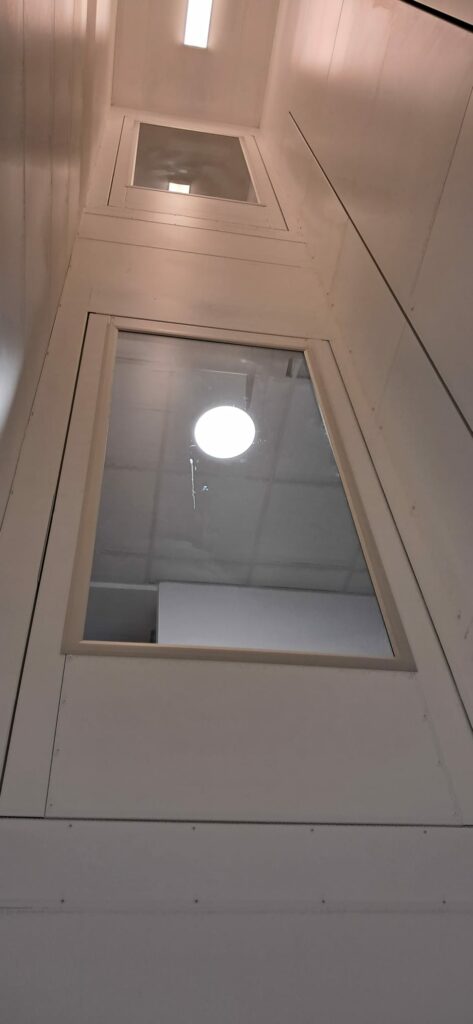 Ce modèle se distingue aussi par son design scandinave. Sa paroi rétroéclairée crée une ambiance moderne et rassurante. Par ailleurs, la main courante éclairée améliore la sécurité et la visibilité. L’appareil installé est en blanc signalisation, une teinte sobre et élégante.