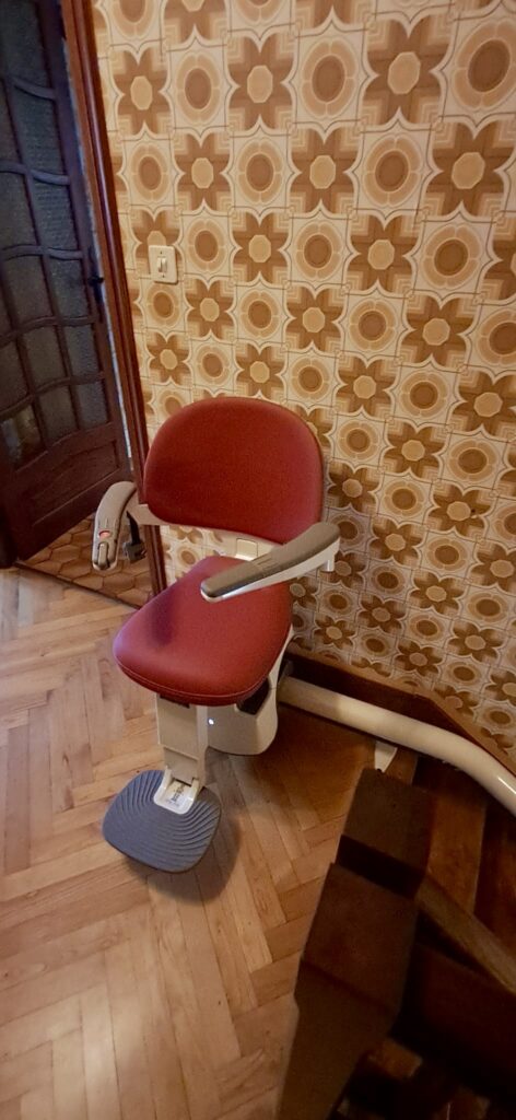 Le résultat est très harmonieux. En effet, la tapisserie du logement s’accorde parfaitement avec la couleur rouge de la chaise. L’ensemble crée une ambiance chaleureuse et légèrement vintage. Ainsi, la solution installée reste à la fois pratique et esthétique, ce qui est important pour nos clients.