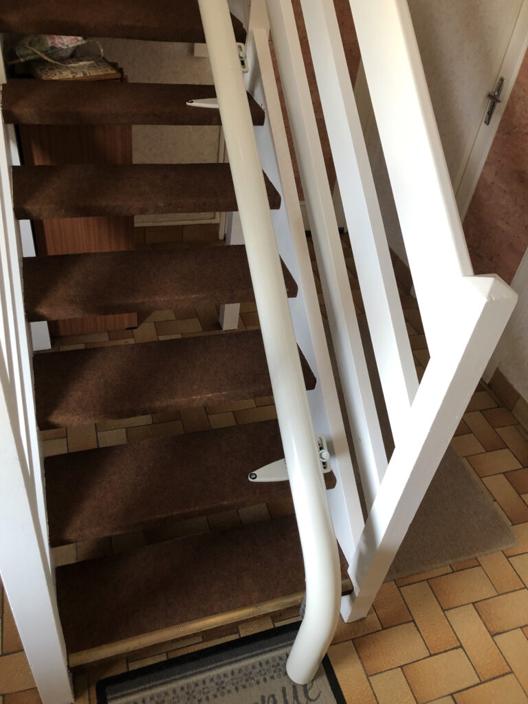 Contrairement à d’autres systèmes, la pose se réalise directement sur les marches. Donc, le mur reste intact. Cette conception unique garantit une adaptation rapide. Par ailleurs, le rail présente un départ vertical visible sur l’installation. Ainsi, l’équipement nécessite seulement 18 cm depuis le nez de la première marche.